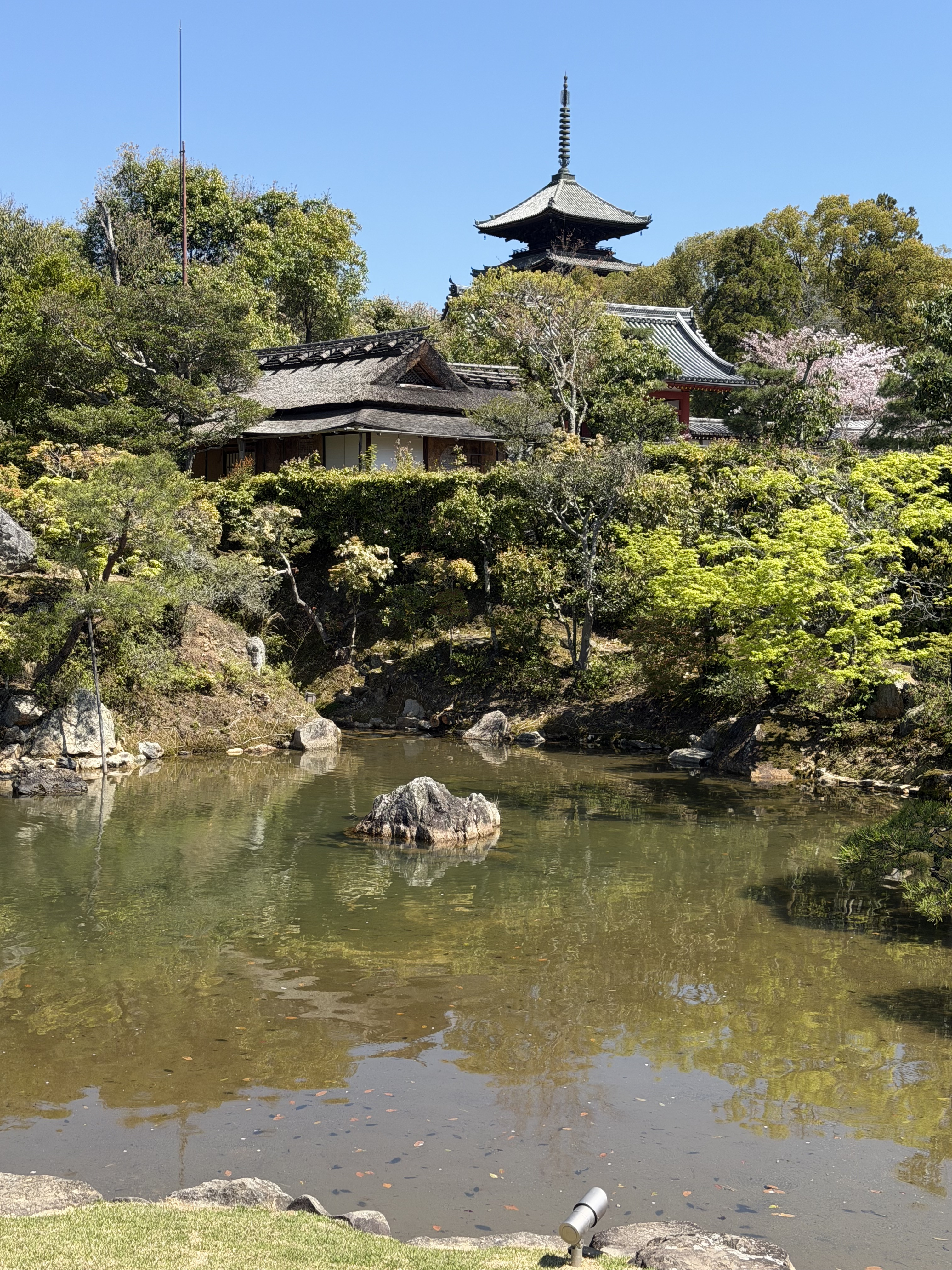 北庭から池越しに、「飛濤亭(ひとうてい)」や「五重塔」